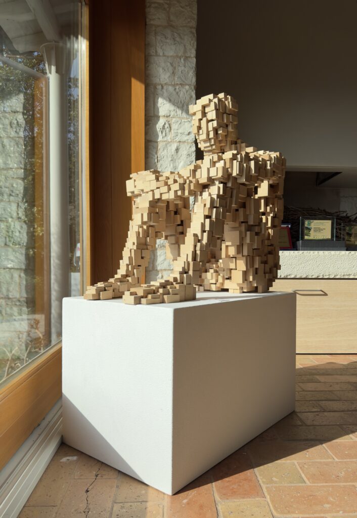 - REFLECTION. Realizzata in legno di tiglio, rappresenta una figura umana accovacciata, pensante e rannicchiata, serena nei suoi intimi pensieri. Lo sguardo scivola verso valle, verso mondi lontani. I cubi in legno di cui è composto formano un pixel contemporaneo di materia e spazi.